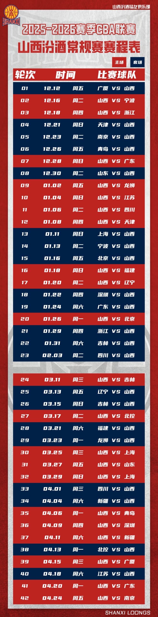 2025-2026赛季CBA联赛 山西汾酒男篮赛程发布